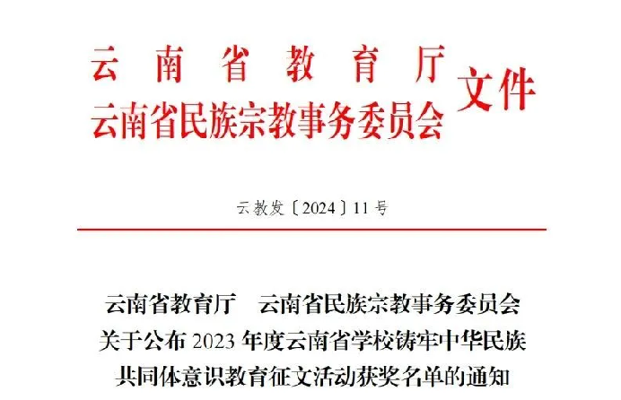 近日,由省教育厅、省民族宗教委组织开展的2023年度云南省学校铸牢中华民族共同体意识教育征文活动获奖名单公布。bb贝博艾弗森官网选送作品荣获教师组一等奖1项、教师组三等奖3项。