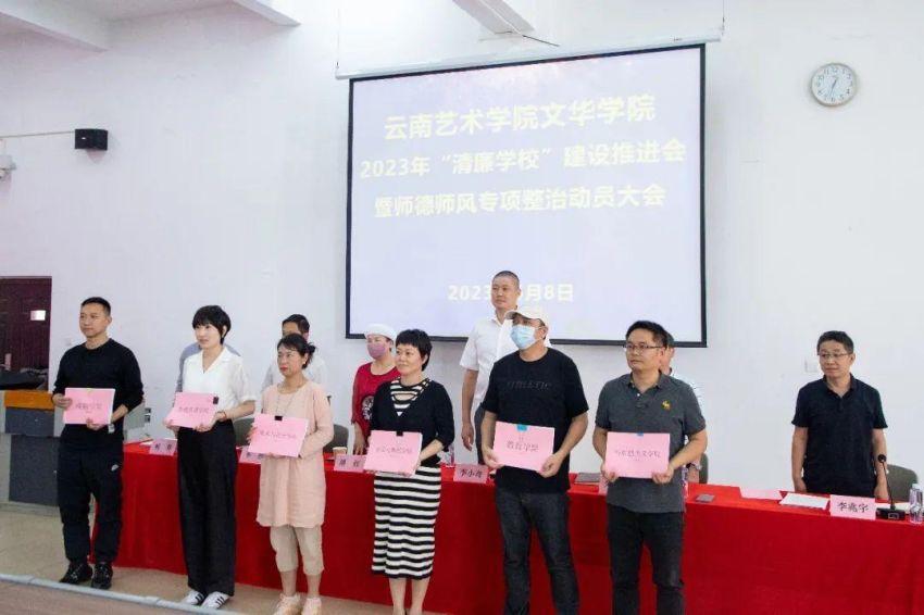 为全面贯彻党中央、国务院,教育部、省委教育工委关于“清廉学校”建设和师德师风建设的部署要求,6月8日,云南艺术学院文华学院召开2023年“清廉学校”建设推进会暨师德师风专项整治动员大会。会议由党委委员、纪检部长、副校长李兆宇主持,学校党政领导及全体教职工参加。