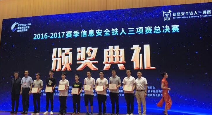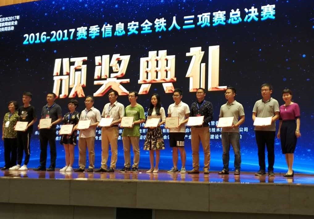 2017年9月23日,信息安全铁人三项赛2016-2017赛季全国总决赛在武汉举行。由国家网络安全学院15081实验班本科生何适之担任队长、陈震杭、何瑶杰、胡岸琪、田铭垚、史鹿曼、王应军等6名同学组成的freepower战队参加现场角逐,最终荣获比赛二等奖。红足1世官网陈晶老师和何琨老师荣获优秀指导教师奖。