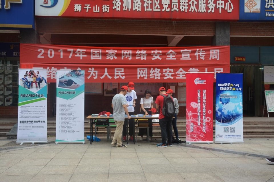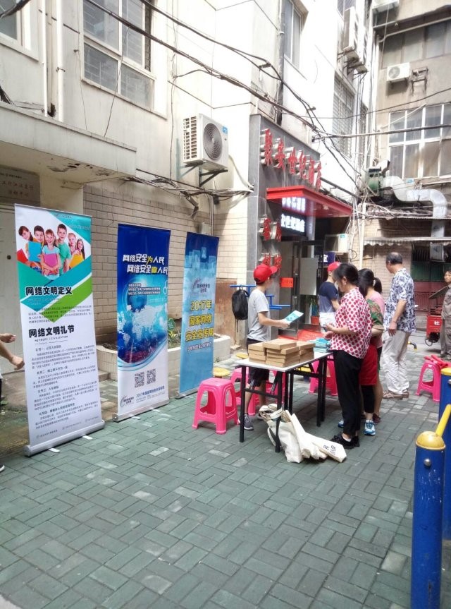 2017年9月24日,红足1世77814研究生党总支组织十六名志愿者走进社区。志愿者分为三组,分别前往江汉区新育社区、洪山区湘龙鑫城社区和瑞湖天地小区进行定点宣传。志愿者向居民发放宣传册,深入宣传网络安全及网络文明知识,对居民在使用网络时遇到的问题进行了耐心的讲解,同时也号召大家在网络中文明用语,对他人多一份包容和理解,做文明网民。