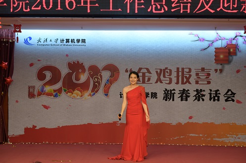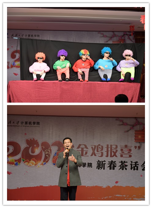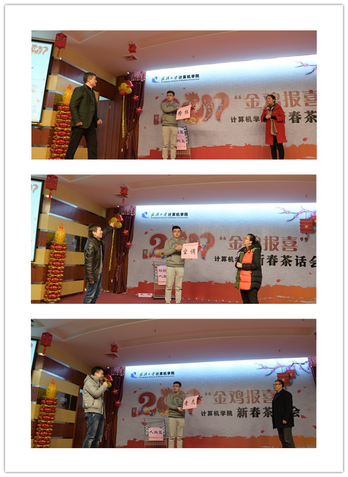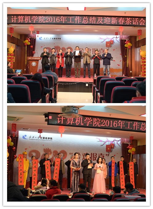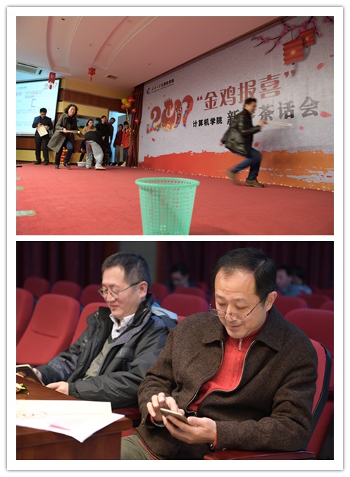 全院各工会小组带来的节目精彩纷呈。计算中心表演的舞蹈《映山红》是舞蹈俱乐部一年来坚持锻炼的艺术成果,悦动的旋律、曼妙的舞姿传达出广大教师热情奋进的气息;歌曲《把一切献给党》唱出了实验教学中心党员同志的奋斗心声;舞蹈《大王叫我来巡山》跳出了青年人的活力干劲;研究生带来的《小人舞》俏皮可爱,幽默诙谐;太极表演是学院太极拳俱乐部的拿手好戏,“捧、捋、挤、按、采、冽、肘、靠”一招一式打出了健康打出了计科人动静结合的内在气质;离退休女教职工带来的时装表演仿佛让大家看来了青年时代的她们,微笑依然、风采依然、热情依然;学校教职工卡拉OK大赛冠军得主陈颖薇老师一曲《我的深情为你收获》把联欢气氛带入高潮,她专业的唱功技巧配上高雅端庄的气质,让节目更加赏心悦目。穿插的抽奖、互动游戏等,惊喜不断。节目最后学院老、中、青三代属“鸡”人,为大家展出春联,送出祝福,祝全院师生在新的一年里身体健康、奋发有为。