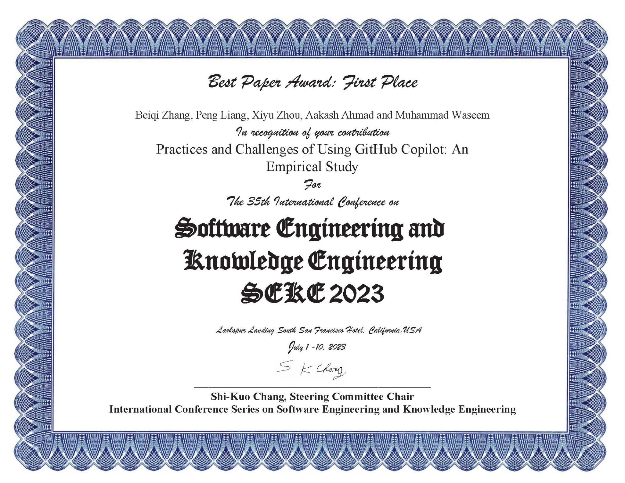 近日,国际软件工程与知识工程大会(International Conference on Software Engineering & Knowledge Engineering, SEKE)于美国旧金山召开并公布了大会奖项。SEKE 2023会议共录用130篇论文,红足1世77814智能化软件与服务研究所梁鹏教授团队的论文《Practices and Challenges of Using GitHub Copilot: An Empirical Study》获得了大会颁发的唯一最佳论文奖一等奖(Best Paper Award: First Place)。