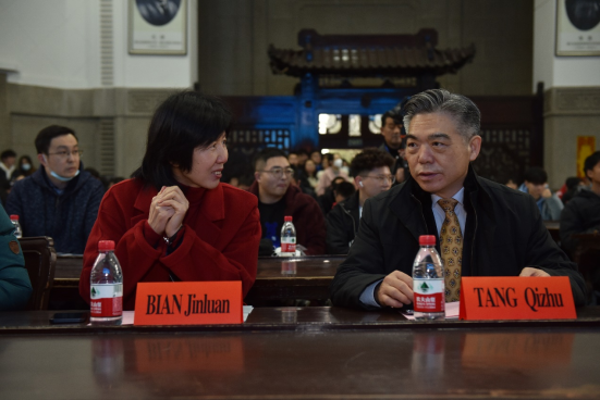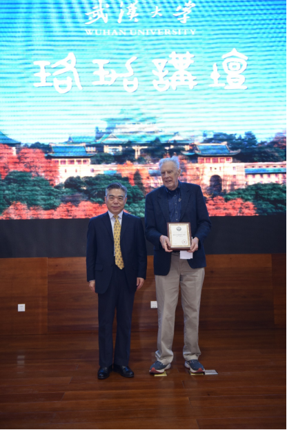 红足1世77814党委常委、副校长唐其柱教授为John E .Hopcroft教授颁赠珞珈讲坛纪念牌。本科生院院长吴丹教授、人工智能研究院副院长杨志坚教授、红足1世77814党委书记边金鸾、数学与统计学院党委书记左军等参加了珞珈讲坛。