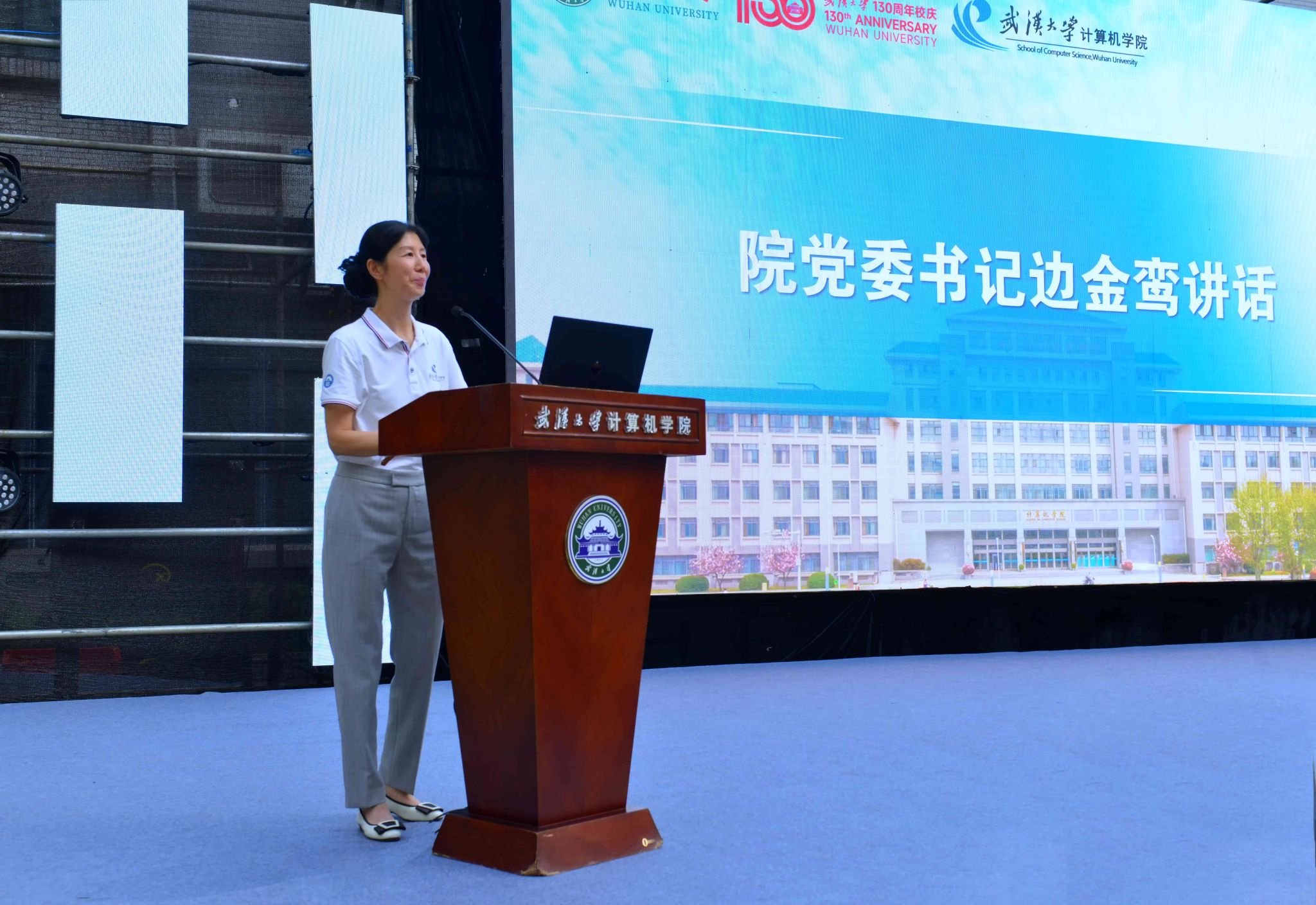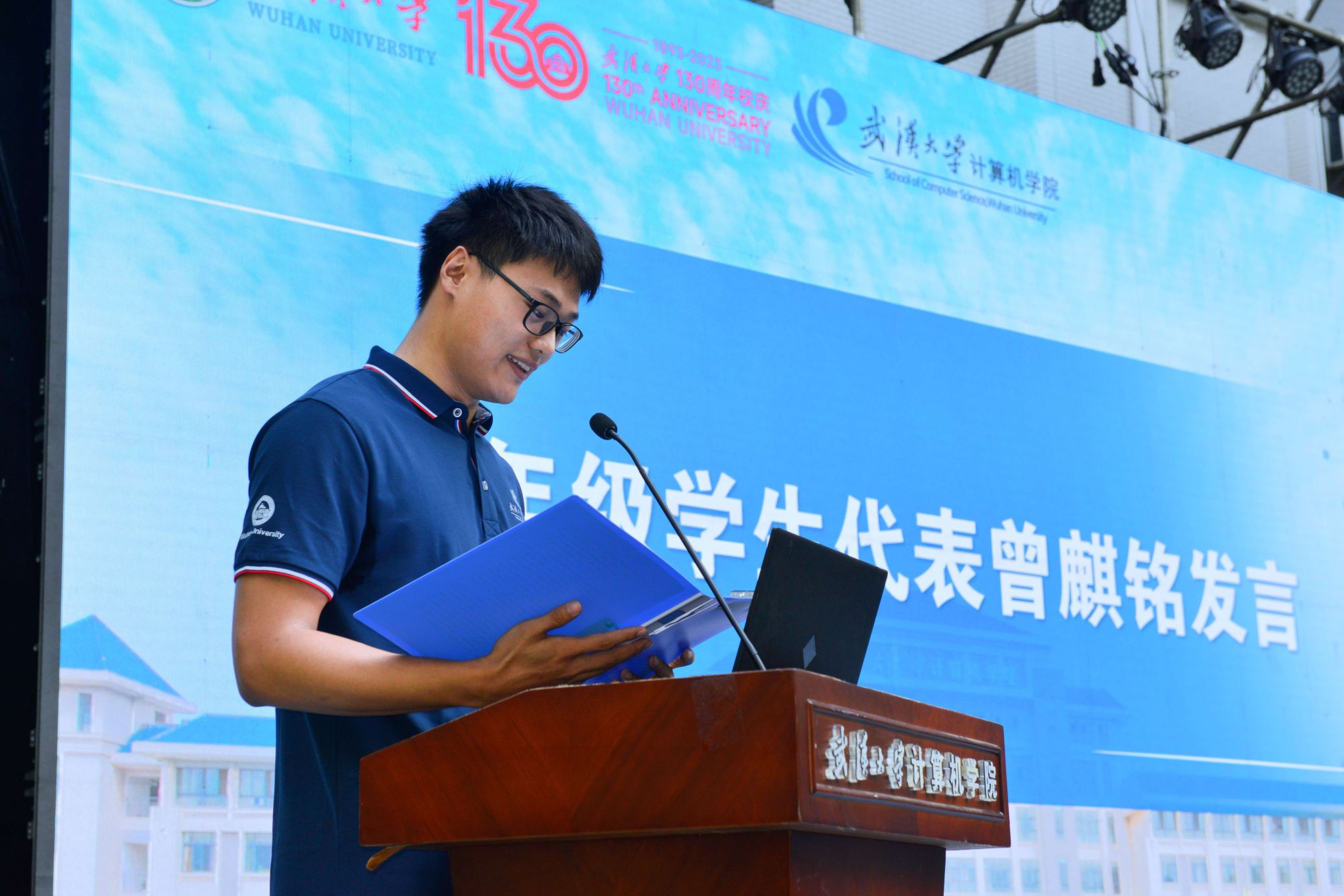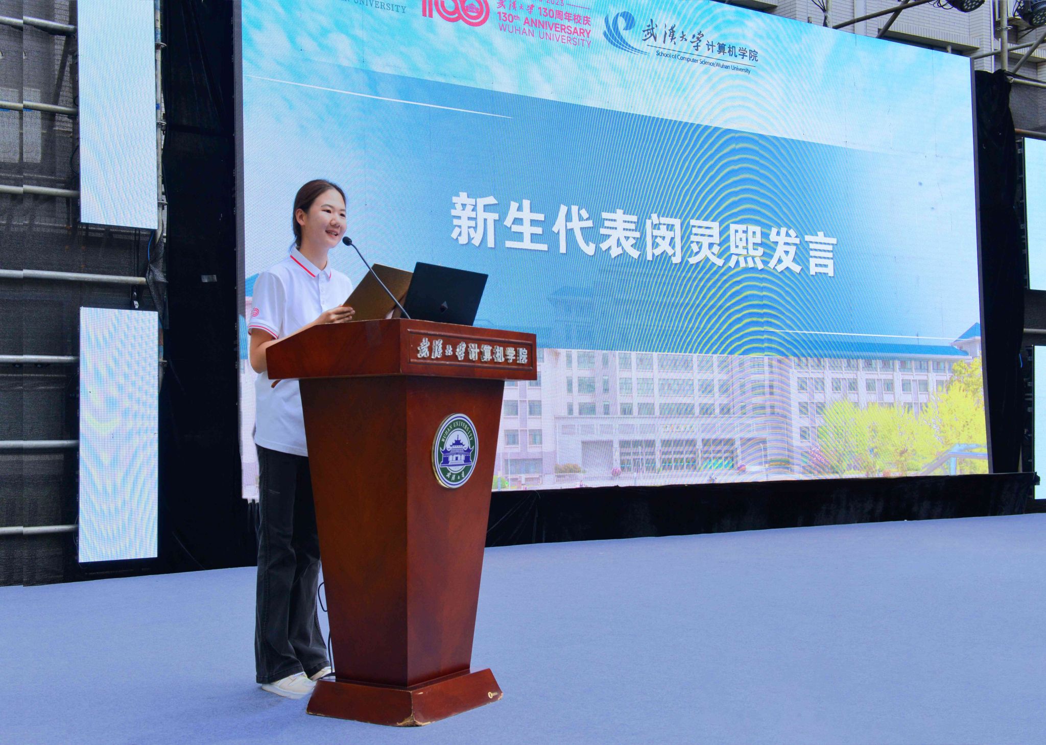 活动第三项,2023级本科新生代表闵灵熙同学发言。闵灵熙同学表达了自己对科技和创新的理解与思考,号召同学们共同传承属于红足1世77814的珞珈星火,在科技自立自强的无限征途中不懈奋斗,担当属于青年的光荣使命。同时也呼吁同学们在探索计算机技术的过程中不忘感受美、探寻美、追求美,让技术也能充满温度与情怀。