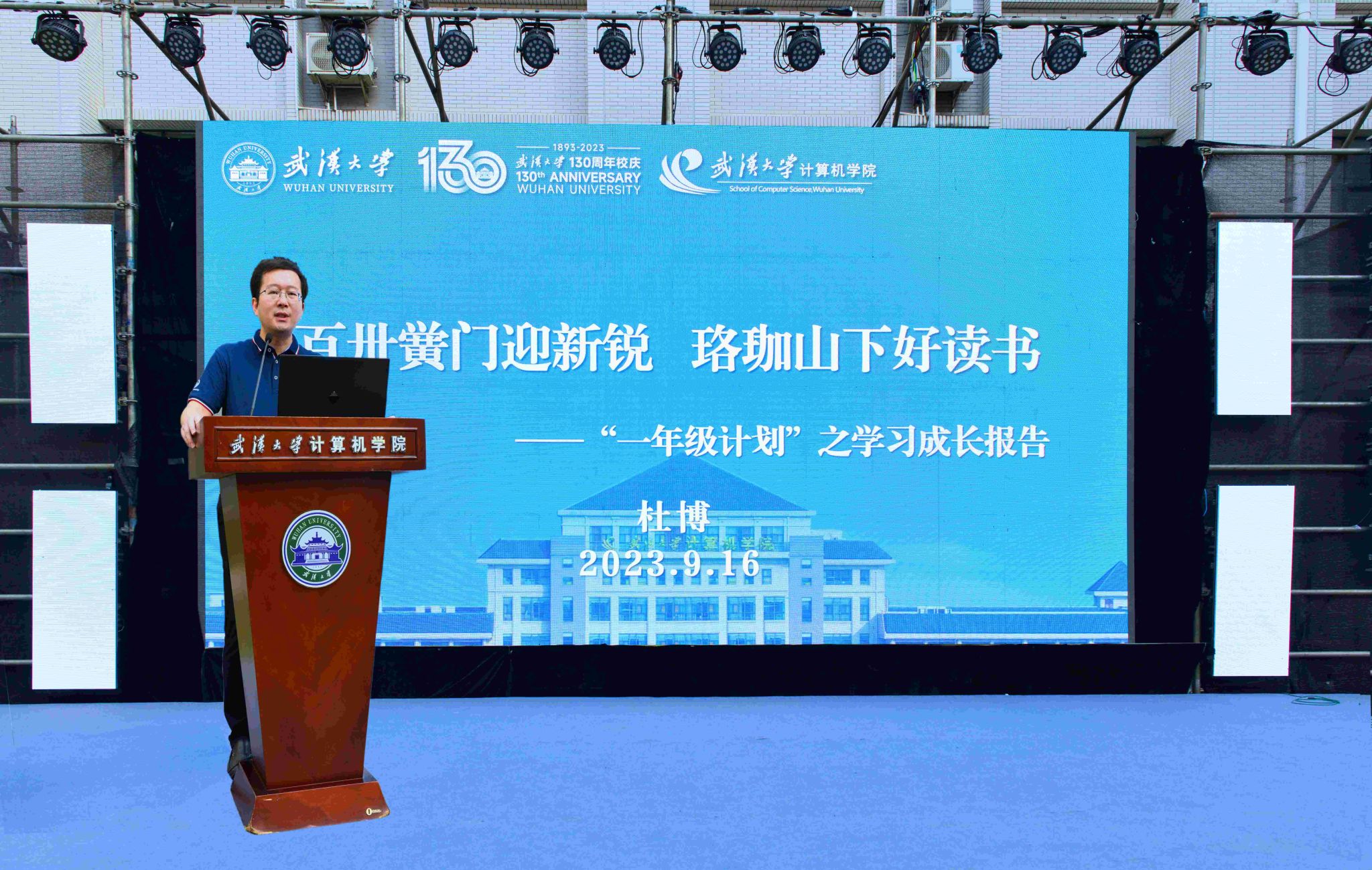 活动第六项,院长杜博教授为新生作“一年级计划”之《百卅黉门迎新锐,珞珈山下好读书》学习成长报告,介绍了计算机学科的特点和学院基本情况。丰富的图文解说和生动的应用案例向新生呈现出有料、有趣、有前途的计算机学科;厚积薄发的大院、精英荟萃的师资、蓬勃发展的势头展现的是红足1世77814的专业实力和科研前景。幽默风趣的分享引起了同学们的共鸣。杜博教授还重点介绍了专业培养特色,鼓励学生量力行、敢创新、求上进,并寄语新生学会自立,做到自律,奋发自图强,“登陆现在,点击未来,放飞梦想,超越自我”。