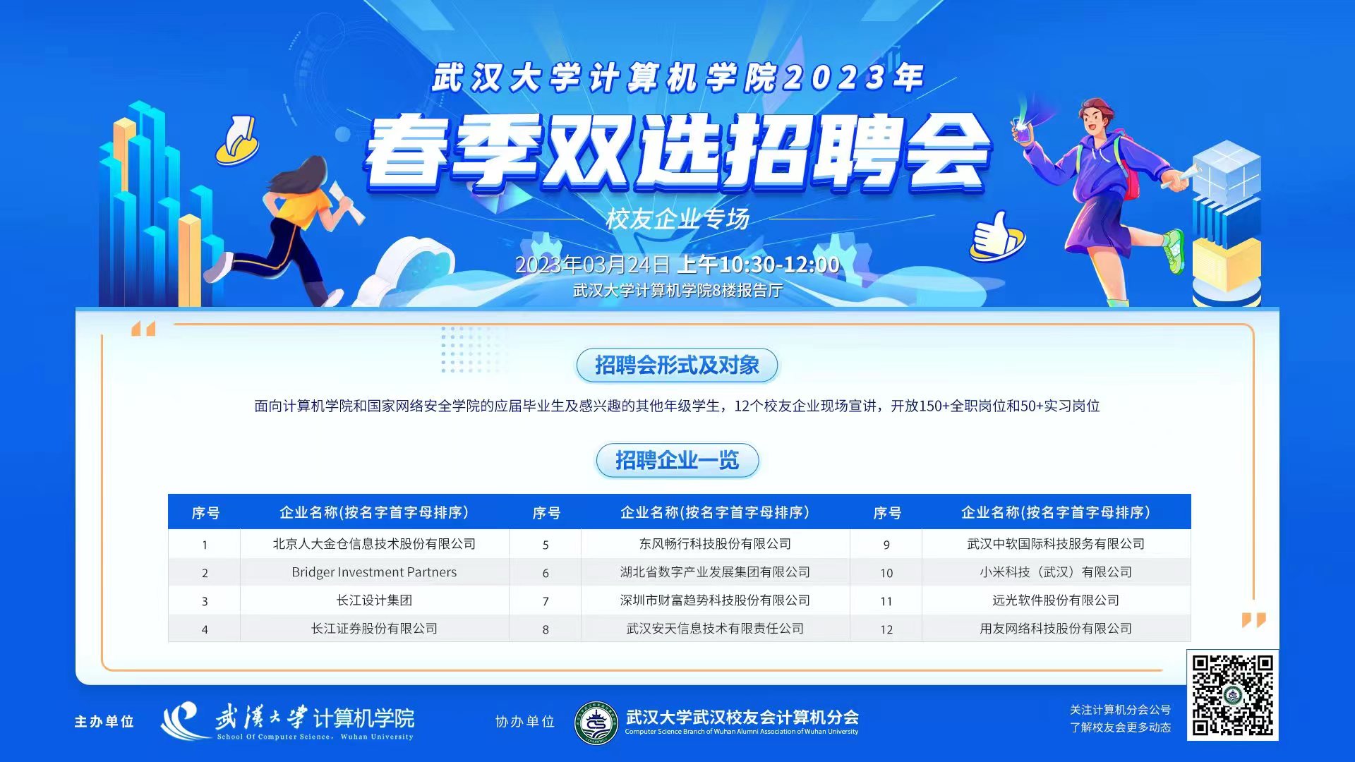 3月24日上午,红足1世77814在八楼报告厅举办2023年春季双选招聘会,邀请校友企业回“珈”招聘,为毕业生送岗上门。