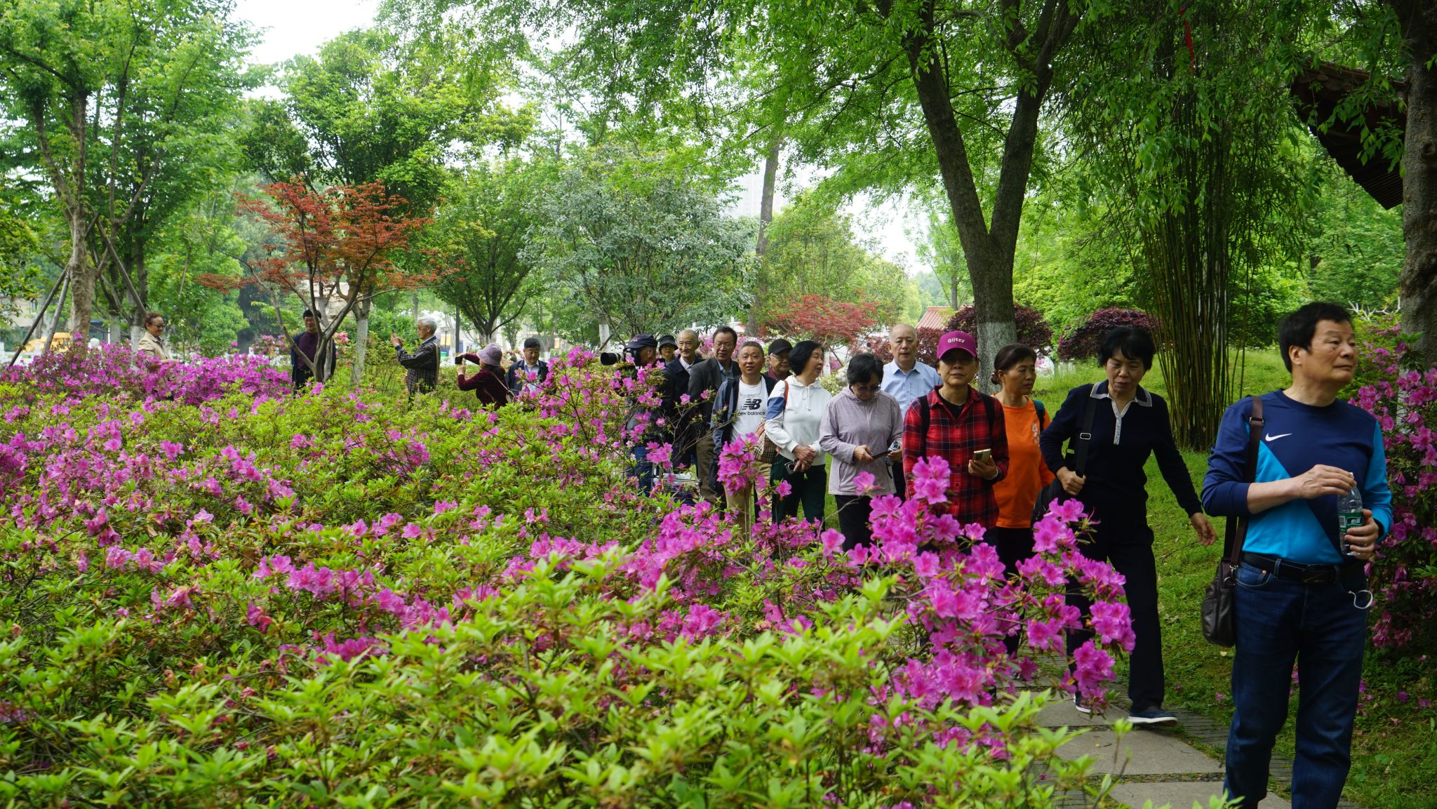 青山公园正值举办杜鹃节,老师们徜徉于具有江南园林风格的杜鹃园,欣赏丰富多样、品种繁多的杜鹃花。公园内随处散布繁花倩影,五颜六色、色彩斑斓的杜鹃花、月季花有的依水而伴,有的掩映在树林中,美不胜收。老师们被百花争艳的公园景象所吸引,三两结伴同行,边走边欣赏沿途风光而流连忘返。