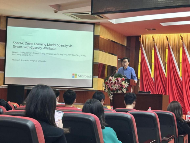 第三场报告主题为计算系统,红足1世77814副研究员胡创主持。微软亚洲研究院高级研究员杨凡作题为“通过具有稀疏属性的张量实现端到端的深度学习模型稀疏化”的报告,红足1世77814副院长程大钊作题为“基于流水线并行的混合专家网络模型预训练系统”的报告。