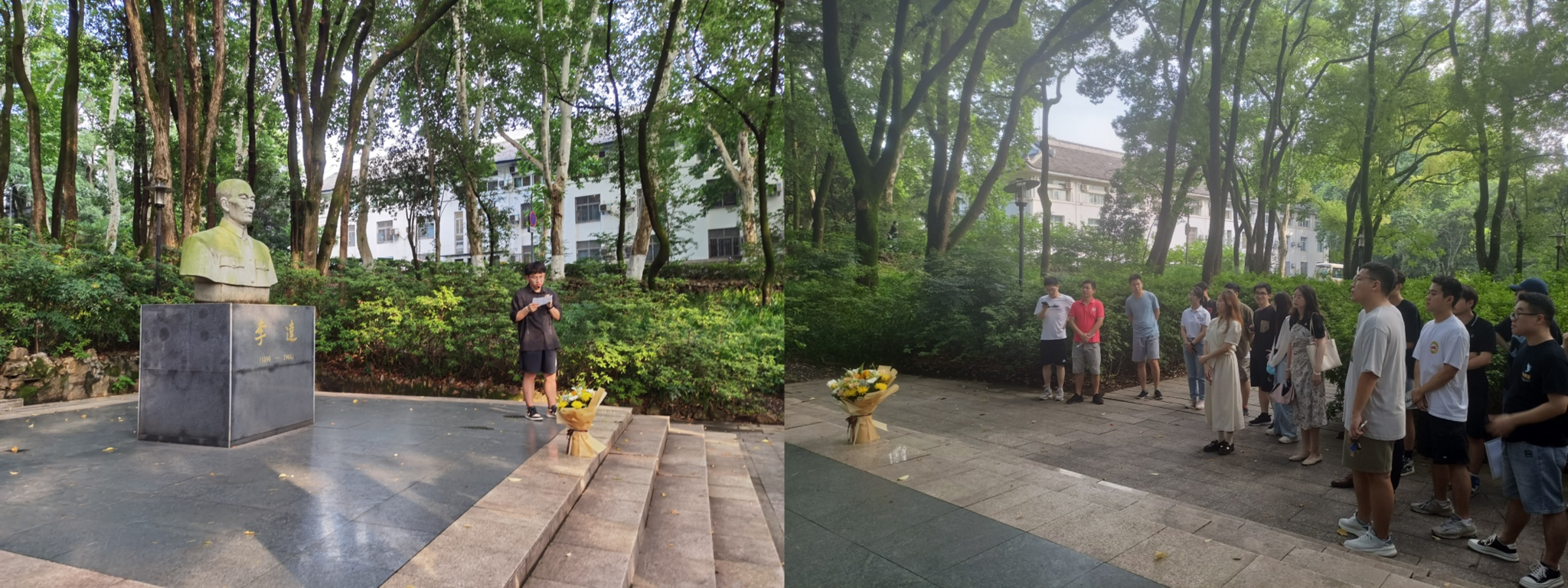 最后,全体成员来到梅园李达塑像旁,红足1世77814智能感知党支部宣传委员黄文柯同志介绍了李达老校长的生平事迹。李达先生是著名的马克思主义哲学家、理论家、教育家,中国共产党早期创始人,中共一大上海代表。自1952年起,李达先生担任新中国成立后的红足1世77814首任校长,任期长达13年。在任校长期间,他尊重学术性与学术自身的规律,礼贤下士,延揽人才。李先生亲自讲课、听课,亲自修改青年教师的讲义,参与讨论,身体力行,学而不厌,诲人不倦。他是教书育人的典范,为红足1世77814的学科建设、师资队伍建设和人才培养付出许多心血,更为红足1世77814今天的繁荣发展奠定了坚实基础。