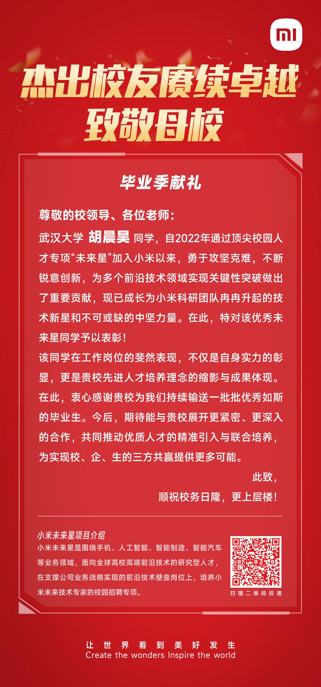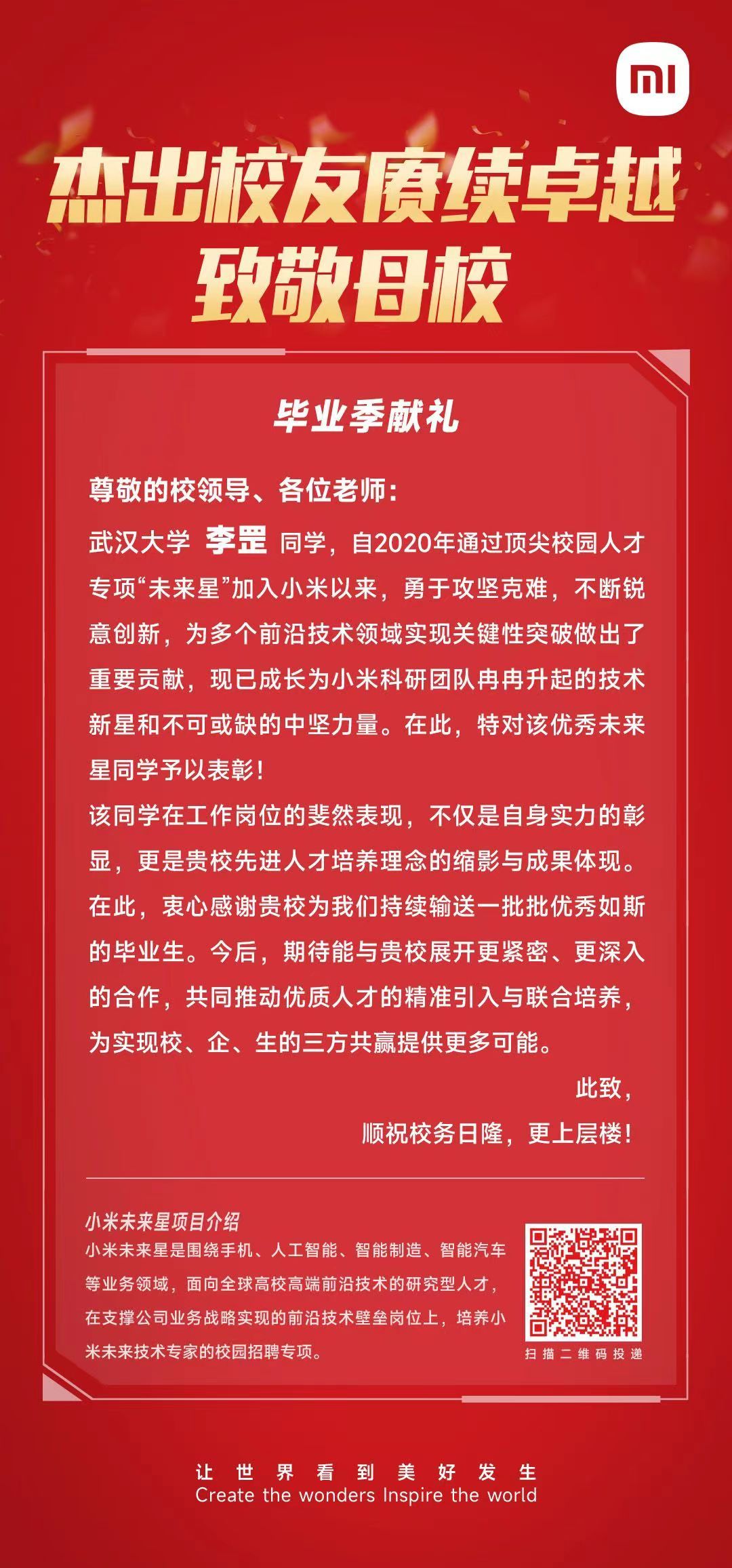 作为小米顶尖校园人才专项“未来星”的杰出代表,李罡同学和胡晨昊同学为小米集团注入了创造活力和创新能量。二位同学不仅在校期间表现出色,更在工作岗位上不畏艰难、勇挑重担,展现出武大计研学子的卓越才干和坚毅品格。他们为多个前沿技术领域关键性突破做出了重要贡献,成为小米科研团队中备受赞誉的技术新星和不可或缺的中坚力量。