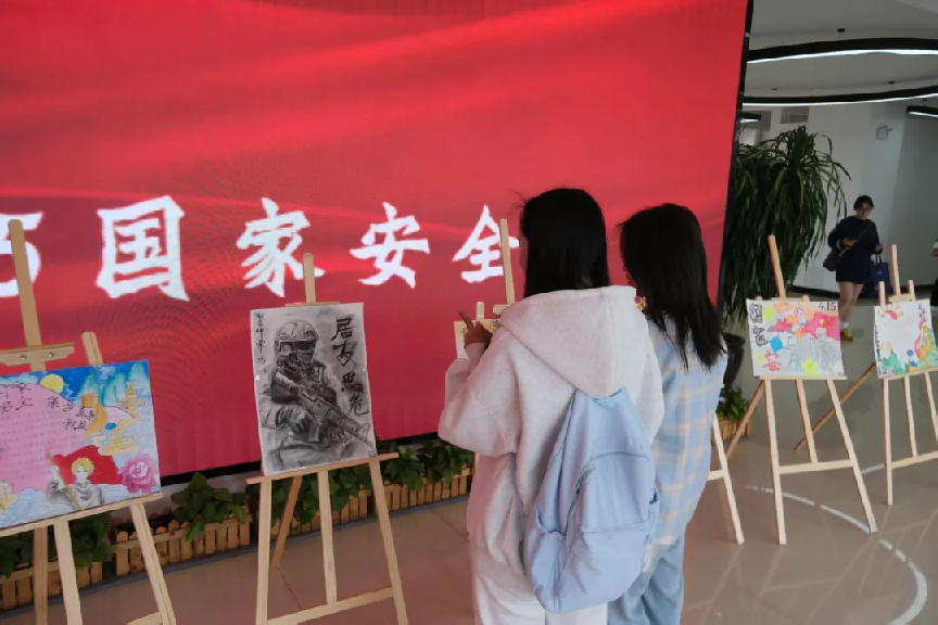 同学们发挥创意,用画笔勾勒出对国家安全的理解,以文字抒发维护国家安全的坚定决心。许多优秀作品被展览在亦归楼大厅,引来了无数同学们的围观。