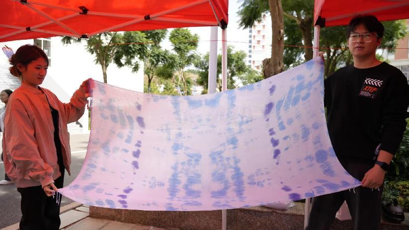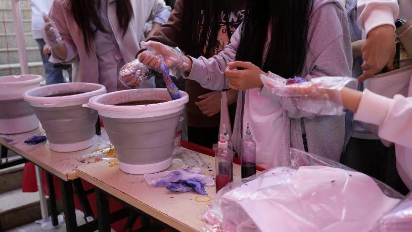 扎染区的白棉布与多彩染料整齐陈列,同学们跟随志愿者们学习折叠、捆扎技巧,从“随意创作”到“精准控色”,看着白布在染料中逐渐晕染出独特纹路,每个人都收获了专属的“秋日限定”扎染作品带来的快乐。