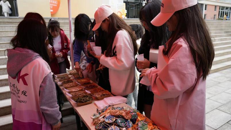 香囊制作区飘着淡淡的药香,艾叶、丁香、薄荷等中药材分装整齐,同学们仔细挑选配料、填充布袋、并进行装饰。一个个小巧精致的香囊不仅是实用的随身物件,更承载了对老人们的最真挚的祝福。